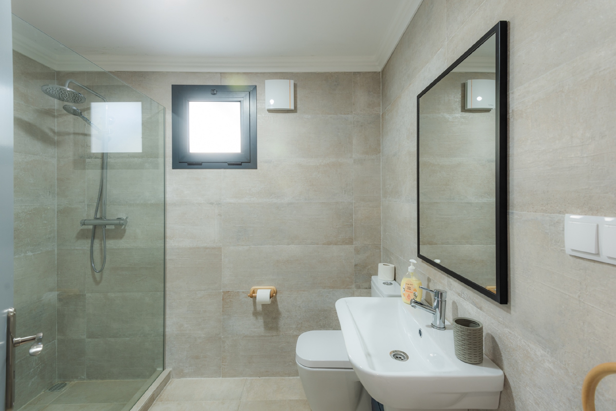 Each bedroom has Traditional shutters which are multi purpose. Not only for security, but to restrict the afternoon heat so that the room can remain cooler. The shutters have a modern perforation design, to allow air through but keeping out any unwanted light. We do not fit curtains, because these would restrict the natural airflow.
