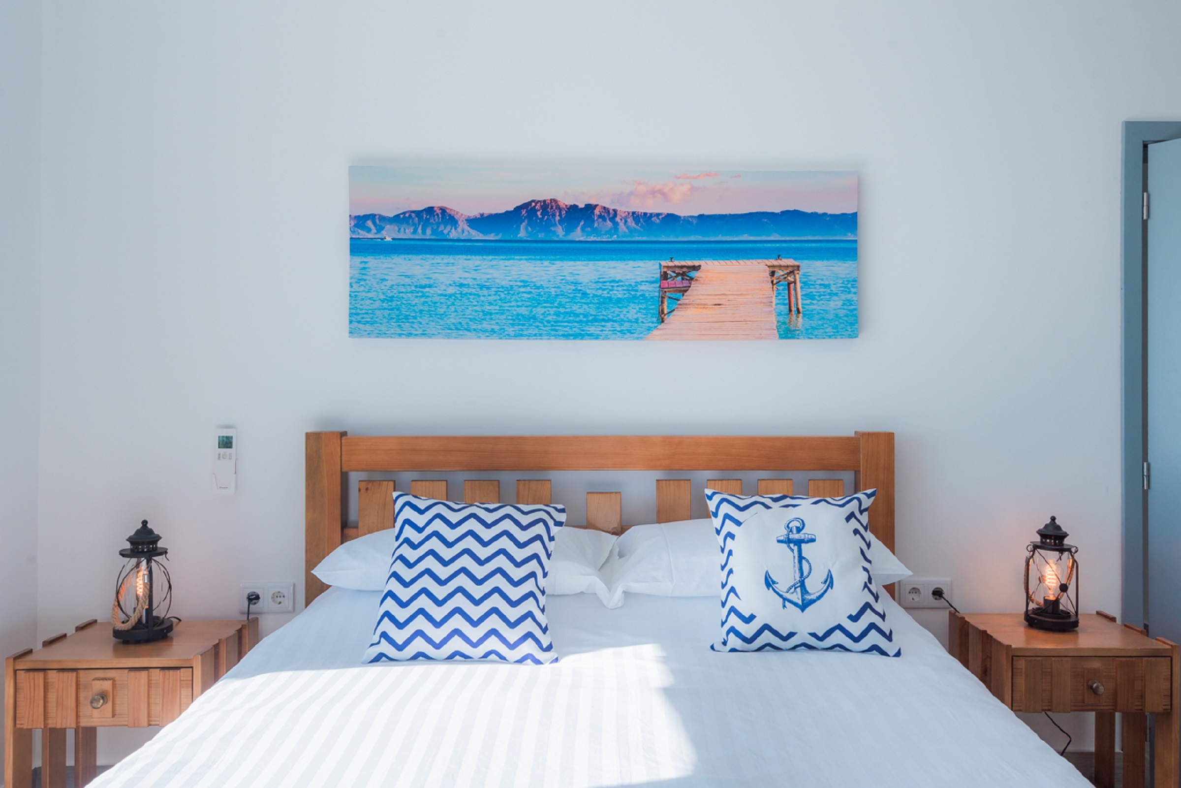 Furnished with a Queen size wooden bed, custom made to our design. The Balcony provides superb views of the sea and sunset.